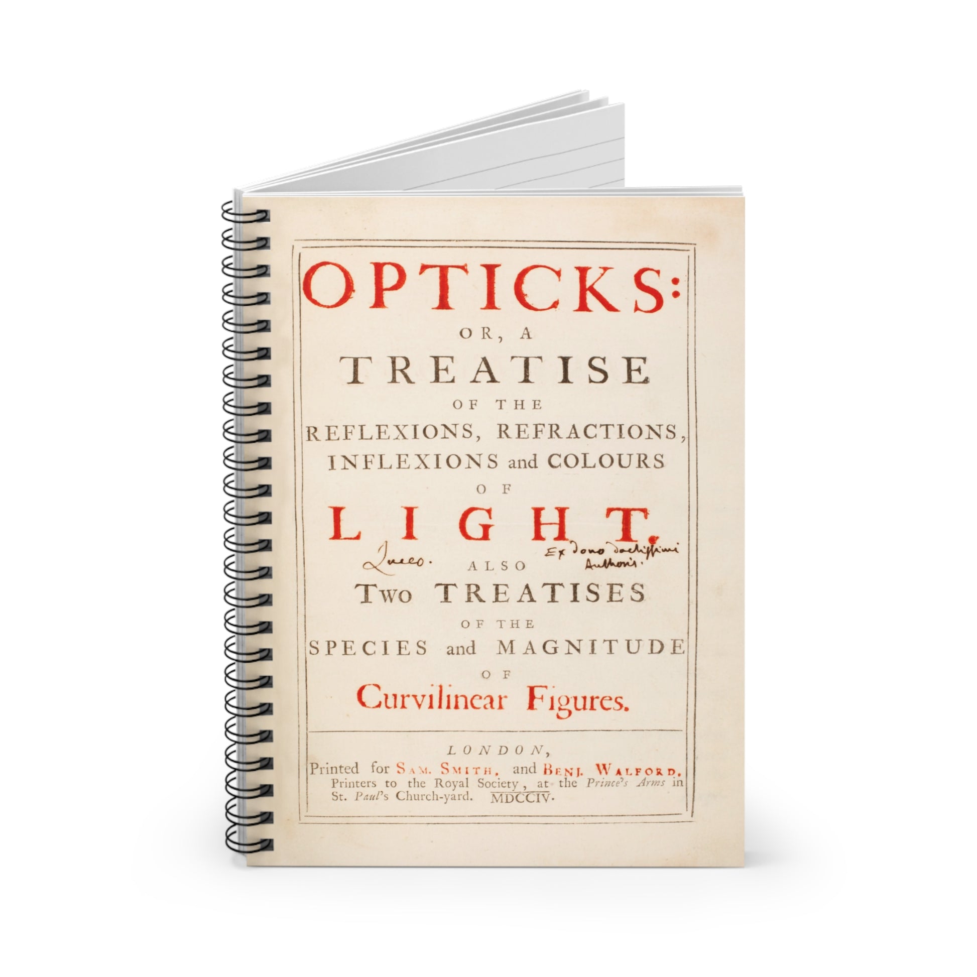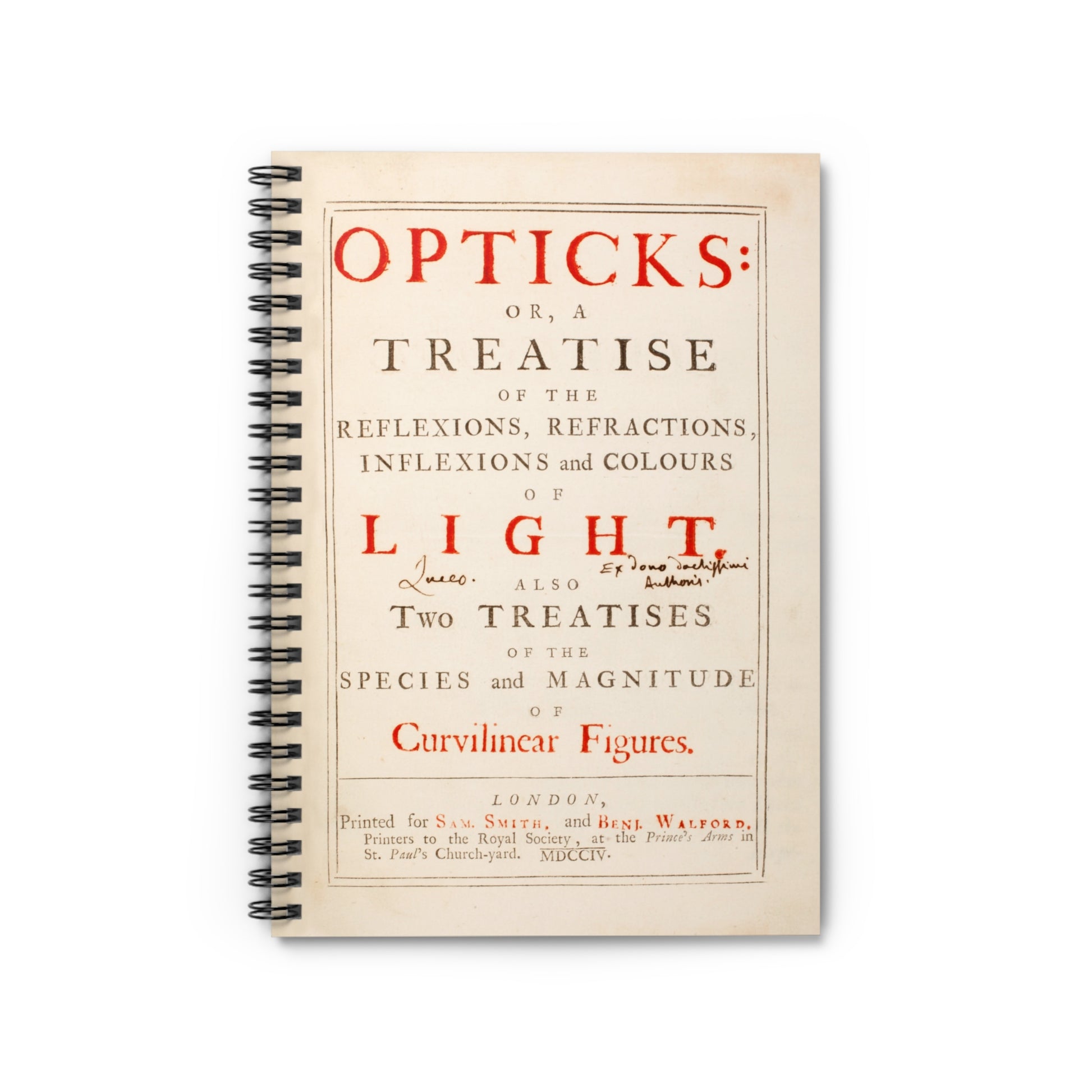 Capture your thoughts, ideas, and inspirations in a notebook that celebrates the genius of Isaac Newton. This 118-page spiral notebook features the title page of Newton's groundbreaking work, Opticks, specifically from the personal copy gifted to Edmund Halley. The title page includes two inscriptions in Halley's own hand, in Latin: 'Ex dono doctissimi Authoris' (from the gift of the most learned author) and 'Luceo' (I shine or I become light).