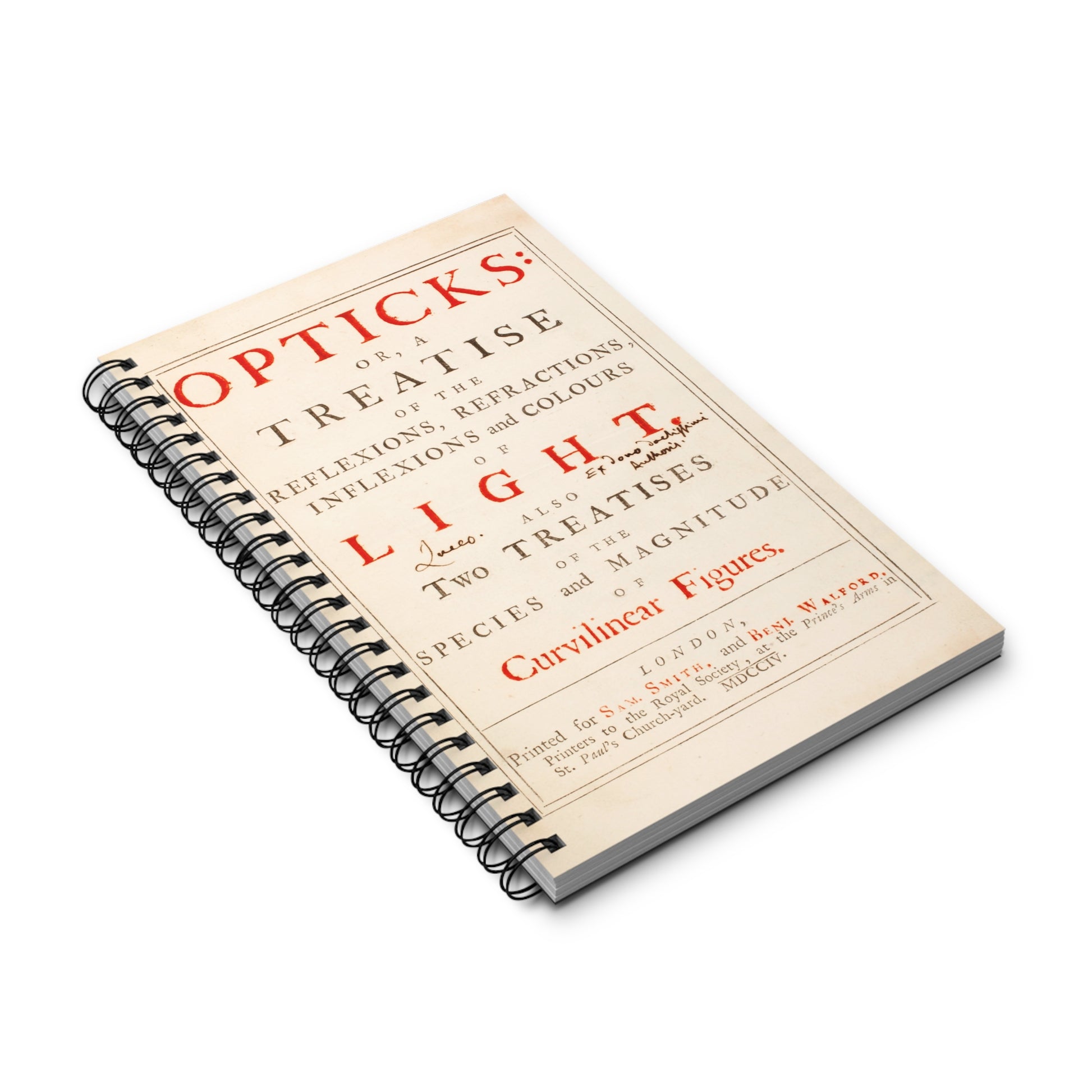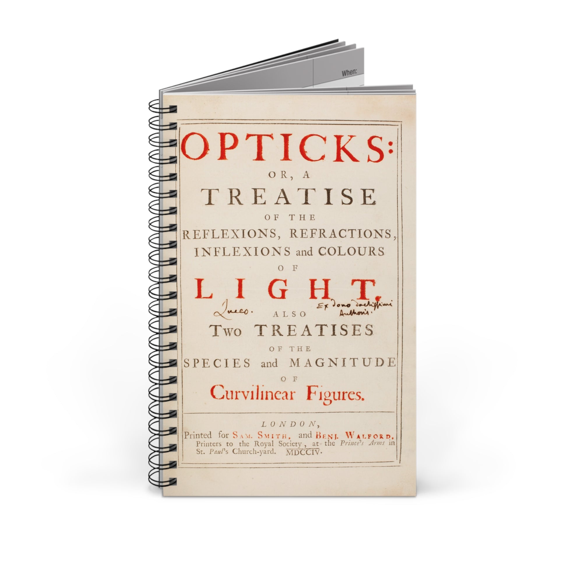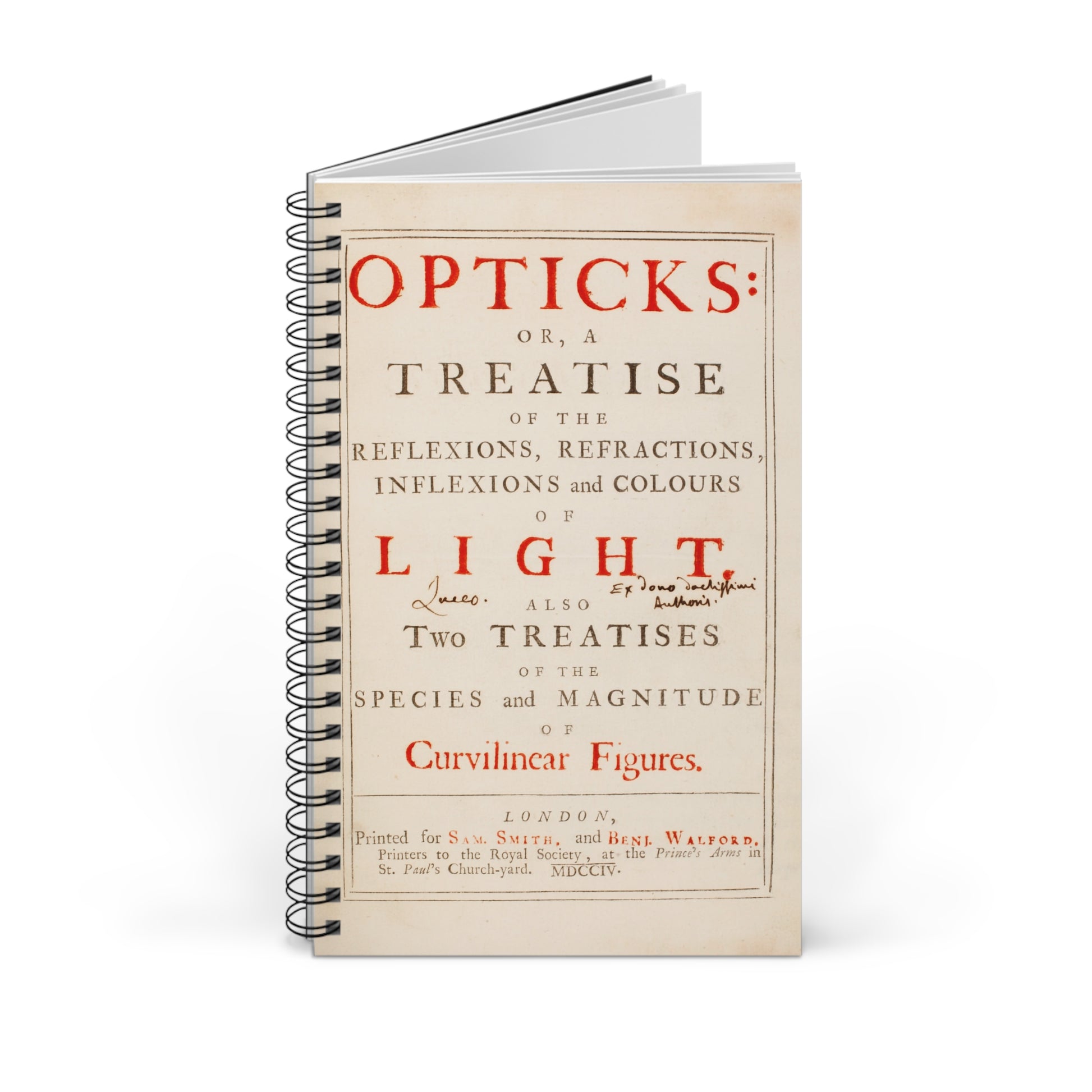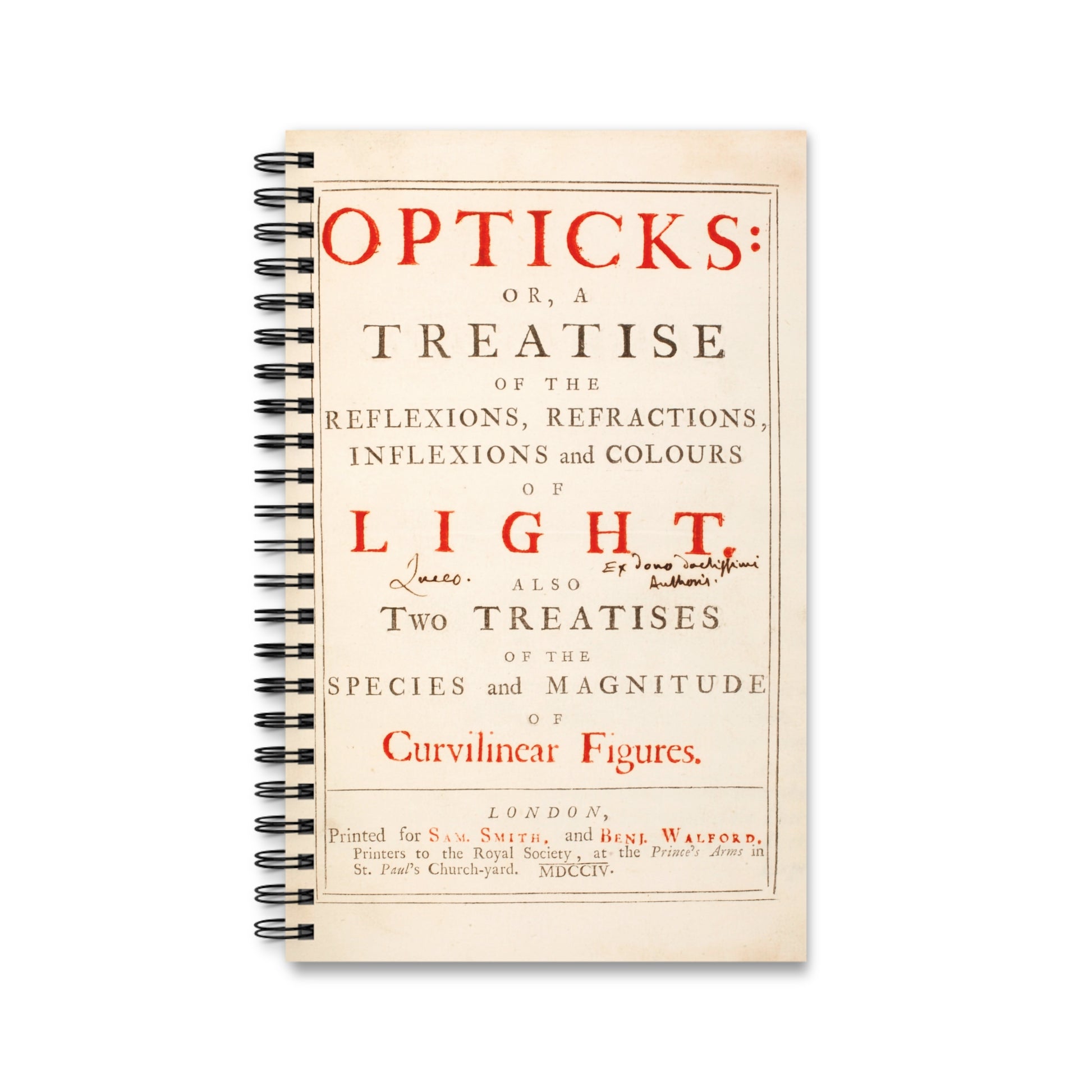 Capture your own brilliant ideas in a journal that echoes the brilliance of Sir Isaac Newton. This spiral-bound notebook features the title page from Newton's 'Opticks', taken from the very copy he gifted to his friend Edmund Halley. See the inscription in Halley's hand, 'Ex dono doctissimi Authoris' - 'from the gift of the most learned author' and 'Luceo', meaning 'I shine'.